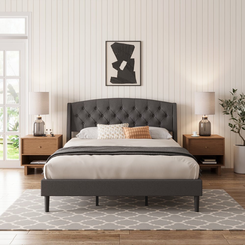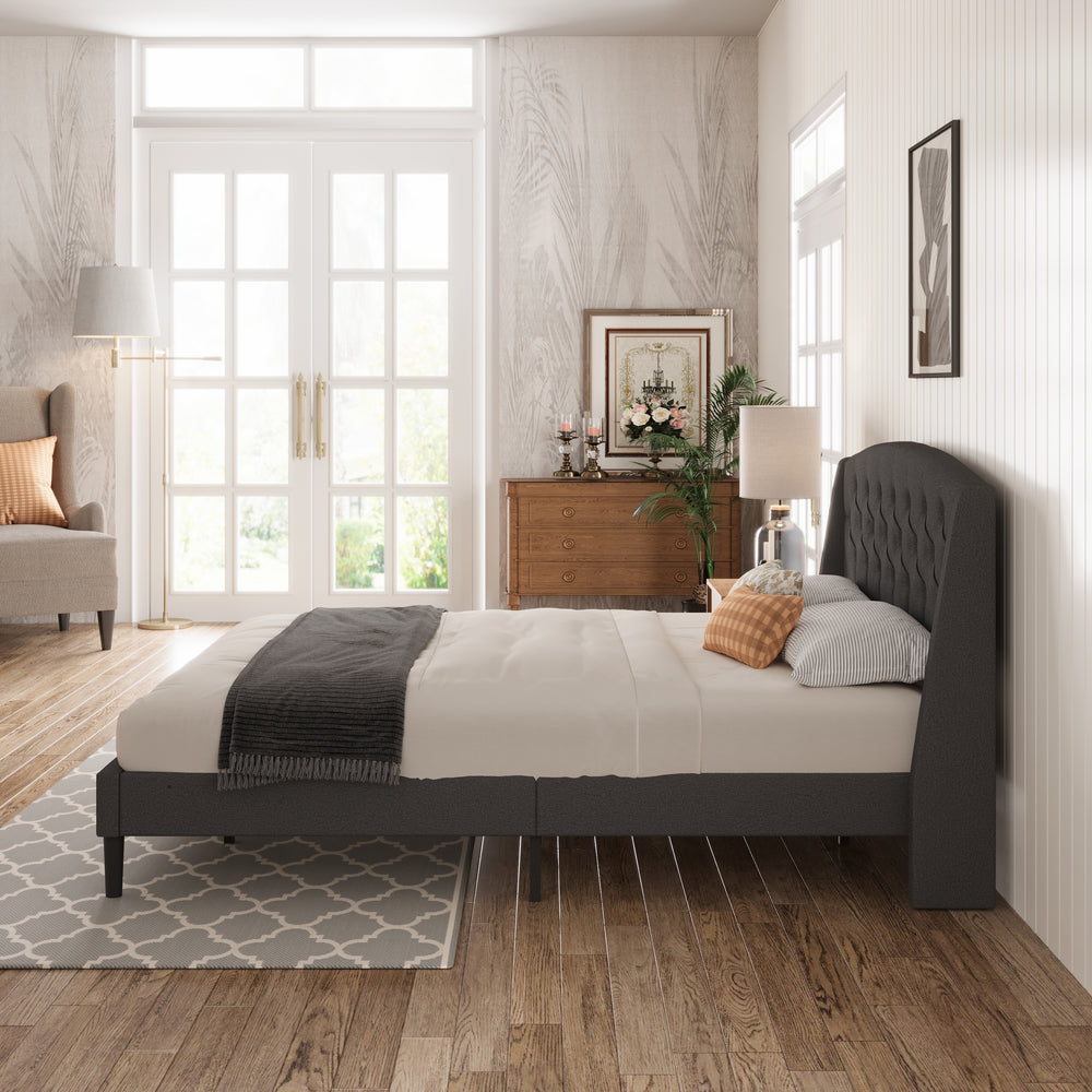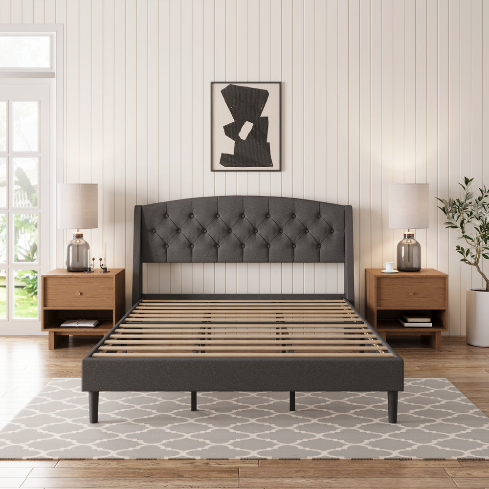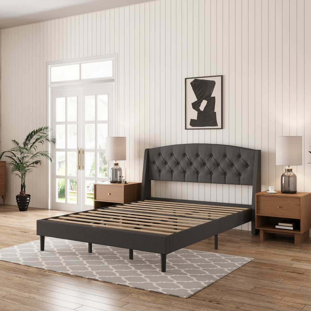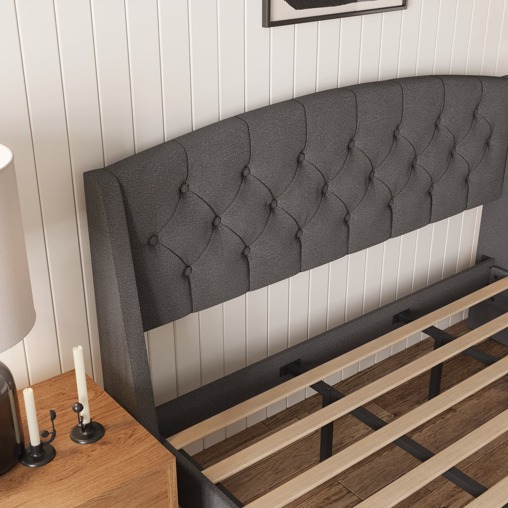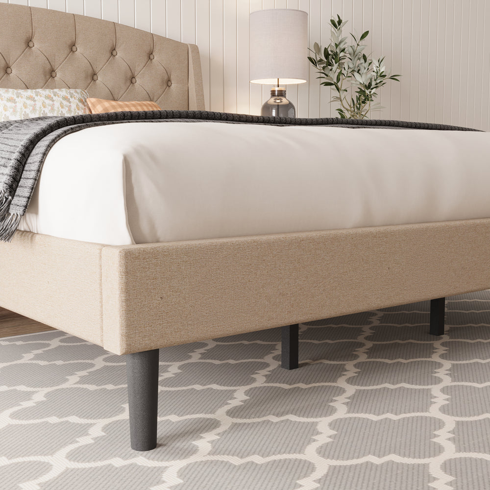 Elevate your bedroom with this wingback bed frame that blends style and function. Plush linen headboard with soft padding creates a cozy, sophisticated focal point. Steel-reinforced frame and plywood slats provide stable support, while under-bed storage keeps your space organized. One-box delivery with included tools ensures quick, hassle-free assembly.