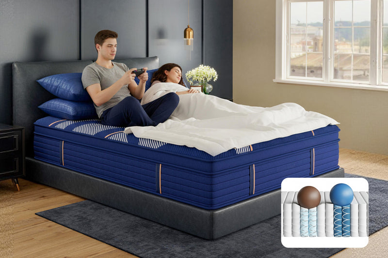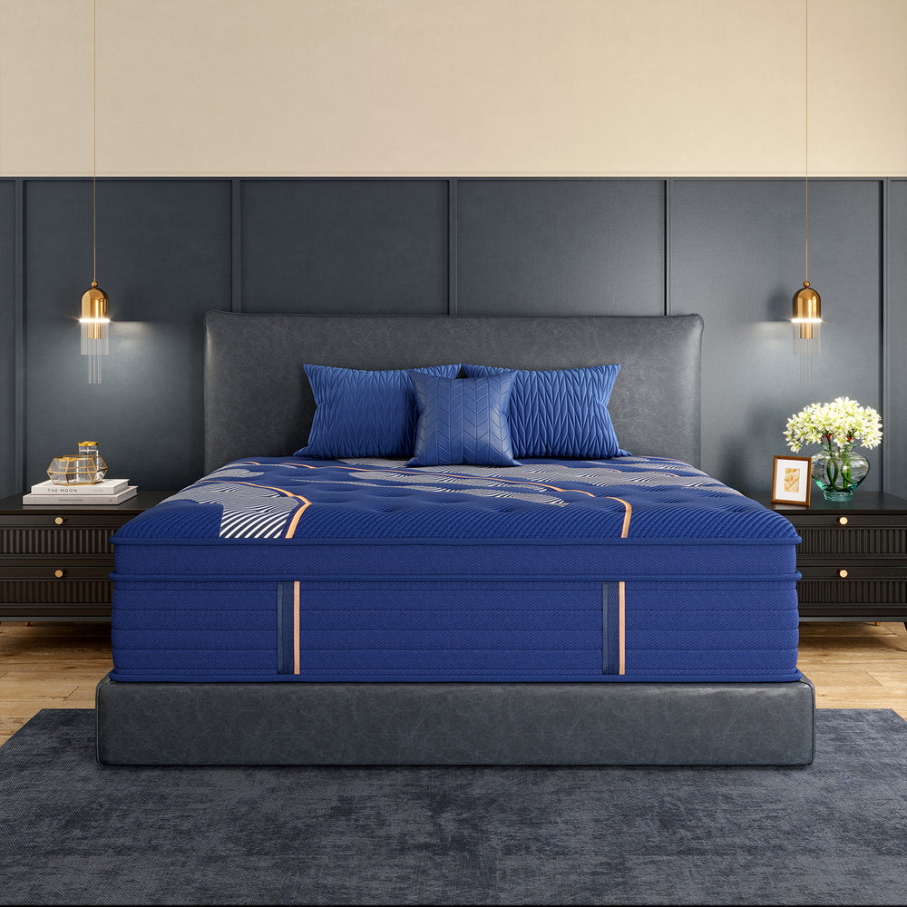 The Marine Blue Luxe Hybrid Mattress delivers premium hybrid performance in two comfort options — Medium and Firm. Featuring a breathable quilted cover, gel-infused memory foam, responsive transition layers, and a dense pocketed coil core, it offers balanced support, cooling airflow, and minimal motion transfer. Reinforced edges and durable, certified materials ensure long-lasting comfort — with the feel tailored to your preference.